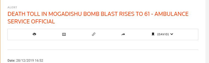 ![]() 路透社报道截图 【环球网快讯】索马里首都摩加迪沙一安全检查站发生汽车炸弹爆炸导致死伤人数过百。法新社援引救护车服务人员的话称,爆炸已经造成76人死亡、70人受伤,并且这一数字仍在增加。 《每日邮报》称,爆炸发生在一个交通繁忙的地带。美联社消息称,汽车炸弹袭击的目标是一个税务中心。 RT还援引摩加迪沙市长的话称,此次爆炸还炸毁了一辆装满了大学生的公交车。摩加迪沙市长在爆炸现场对记者说,政府证实至少有90名平民在爆炸中受伤,其中大部分是学生。目前数十名伤者已被送往医院。