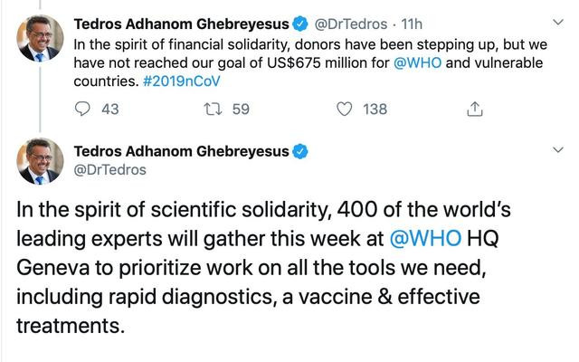 新京报快讯(记者 谢莲)世界卫生组织总干事谭德塞博士9日在社交媒体推特上宣布,本周,400位全球权威专家将齐聚世界卫生组织日内瓦总部,共同制定应对新型冠状病毒肺炎疫情所需要的所有重点工作方案,包括快速诊断、疫苗研发以及有效的治疗方案等。 ![]() 谭德塞博士推特截图 据世界卫生组织官网消息,2月11日至12日,世卫组织将在日内瓦与全球传染病防范研究协作网络共同举办一次全球研究和创新论坛,动员国际社会针对新型冠状病毒(2019-nCoV)采取行动。 此次论坛将汇集知名科学家、公共卫生机构、卫生部以及研究供资机构等主要机构和人士,讨论包括确定新型冠状病毒的来源以及分享生物样本和基因序列等在内的多个方面。 世卫组织称,预计将在会议上制定全球新型冠状病毒研究议程,确定重点和框架,以指导首先应该开展哪些项目。世卫组织首席科学家Soumya Swaminathan博士说:“了解这一疾病、其宿主、传播方式和临床严重程度,然后制定有效的应对措施,对于控制疫情、减少死亡和尽量减轻经济影响至关重要。” 世卫组织突发事件规划执行主任Michael Ryan博士指出,“世卫组织研发蓝图是全球战略和防范平台,用于推动在暴发流行病之前开展药物和疫苗统一开发工作,并在流行病疫情期间迅速启动研发活动。它能够加快救命的诊断工具、疫苗、疗法和技术的供应。” 谭德塞博士9日还表示,应对此次疫情还存在资金缺口。他表示,“我们要在经费支持上紧密合作,已有一些捐助者站出来给予了捐款,但我们仍然离为世卫组织和需要帮助的国家筹资6.75亿美元这个目标有一定差距”。 |