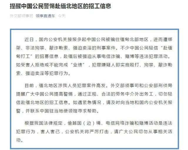 据外交部领事司“领事直通车”微信号消息,目前,缅北地区涉我人员犯罪案件高发。外交部领事司和公安部刑侦局提醒广大中国公民提高警惕,通过正规、合法的劳务中介外出务工,切勿轻信赴缅北地区的招工信息。 ![]() 两部门指出,近日,国内公安机关接报多起中国公民被骗往缅甸北部地区,进而遭绑架、非法拘禁、敲诈勒索、强迫卖淫的刑事案件。不少中国公民轻信“赴缅甸打工”的招募信息,赴缅后被强迫从事电信诈骗、赌博等违法犯罪活动。如受害人拒绝或不能完成“业绩”,犯罪嫌疑人即实施殴打、拘禁、敲诈勒索、强迫卖淫等犯罪行为。 两部门表示,目前,缅北地区涉我人员犯罪案件高发。外交部领事司和公安部刑侦局提醒广大中国公民提高警惕,通过正规、合法的劳务中介外出务工,切勿轻信赴缅北地区的招工信息。如遇紧急情况,请及时向当地和国内公安机关报警,并联系中国驻当地使领馆寻求帮助。 ![]() 两部门强调,根据我国法律规定,偷越国(边)境、电信网络诈骗和赌博活动是违法犯罪行为,害人害己,公安机关将严厉打击,请广大公民切勿从事相关活动。 |